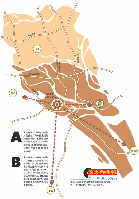 B、大崗先進制造業(yè)基地規(guī)劃片區(qū)離西面的順德區(qū)中心區(qū)只有16公里,離東面的南沙綜合服務(wù)中心只有13公里,離南面的中山市中心區(qū)只有26公里,離東南面的南沙港碼頭只有25公里,地理位置位于附近幾個重要行政或經(jīng)濟區(qū)域的中心地帶。