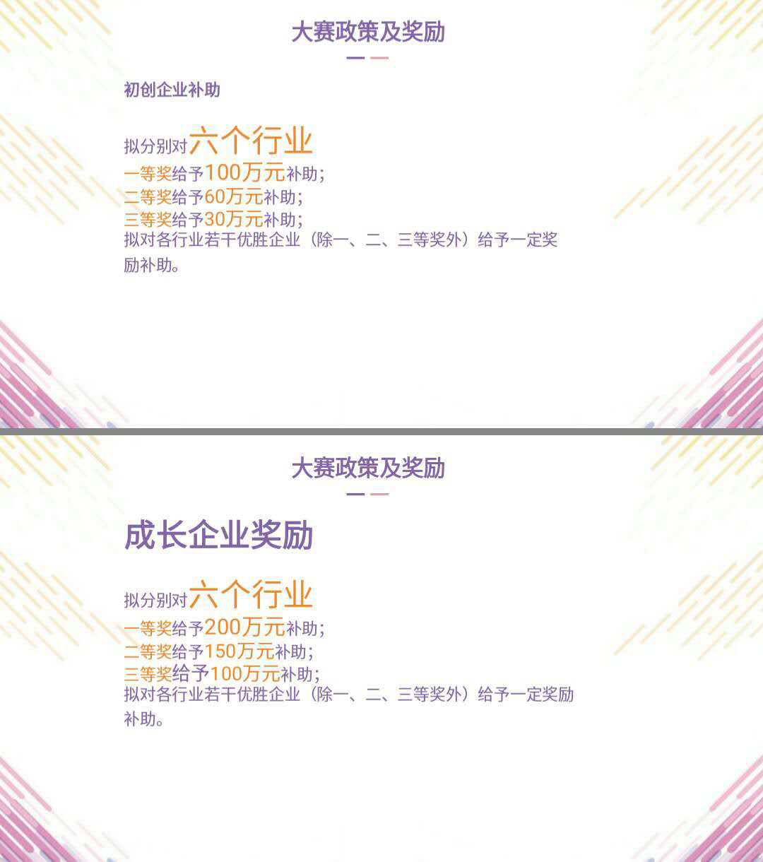 大賽共設(shè)置新材料、生物醫(yī)藥、電子信息、新能源與節(jié)能環(huán)保、先進制造、互聯(lián)網(wǎng)與移動互聯(lián)網(wǎng)6個行業(yè)分賽,每個行業(yè)分賽根據(jù)企業(yè)的注冊時間分為“初創(chuàng)企業(yè)組”和“成長企業(yè)組”兩個組別進行比賽。市賽“初創(chuàng)企業(yè)組”第一名將獲得100萬元政府補助;市賽“成長企業(yè)組”第一名將獲得200萬元政府補助。