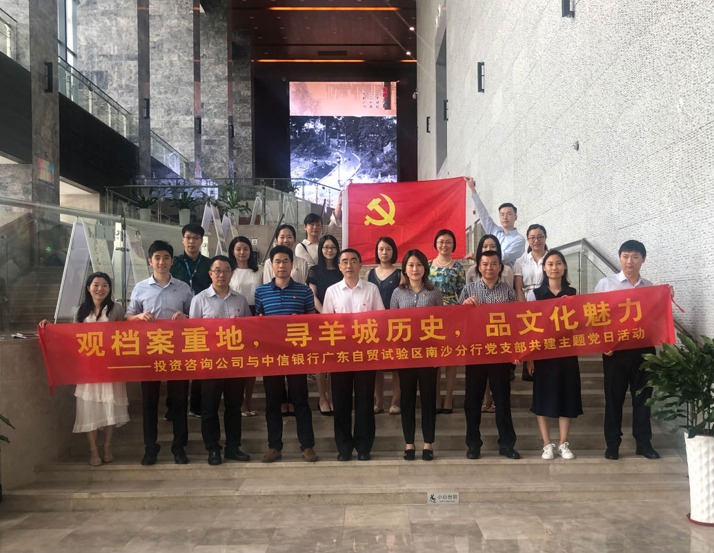 為做好“不忘初心、牢記使命”主題教育工作,全面落實(shí)習(xí)近平總書(shū)記“鑒古知今,學(xué)史明智”的重要講話(huà)精神,發(fā)揮黨支部戰(zhàn)斗堡壘作用,公司黨委下屬投資咨詢(xún)公司黨支部于8月13日與中信銀行廣東自貿(mào)試驗(yàn)區(qū)南沙分行黨支部攜手赴廣州市國(guó)家檔案館開(kāi)展“觀檔案重地,尋羊城歷史,品文化魅力”主題黨日共建活動(dòng)。